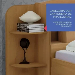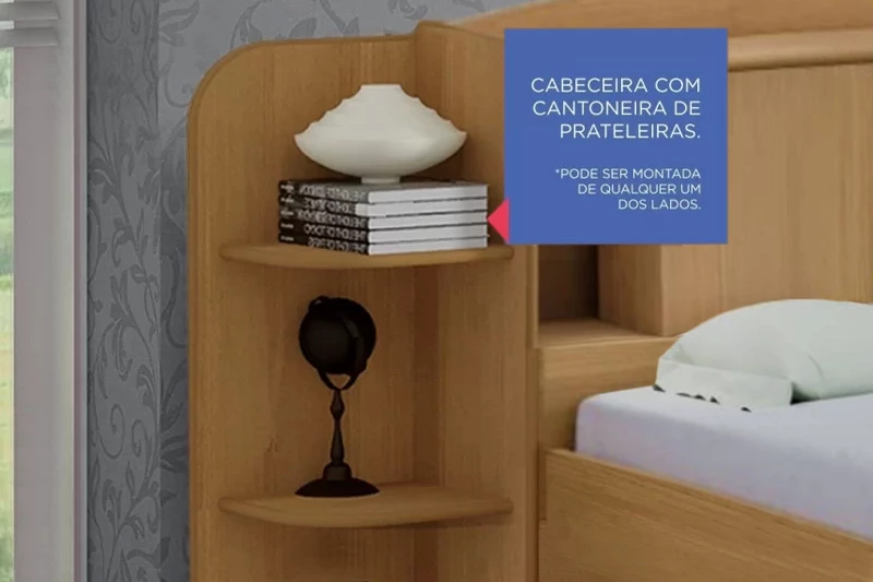 – Prateleira laterais que podem ser usadas para colocar livros, objetos e enfeites. Além disso pode ser montada em ambos os lados da cabeceira.