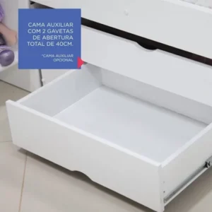 – Cama auxiliar com duas gavetas de abertura total de 40 cm