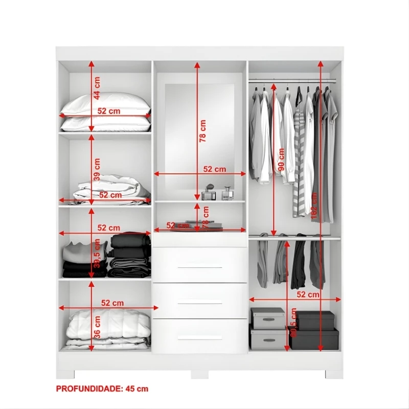 – 3 gavetas externas com corrediças metálicas, proporcionando abertura suave